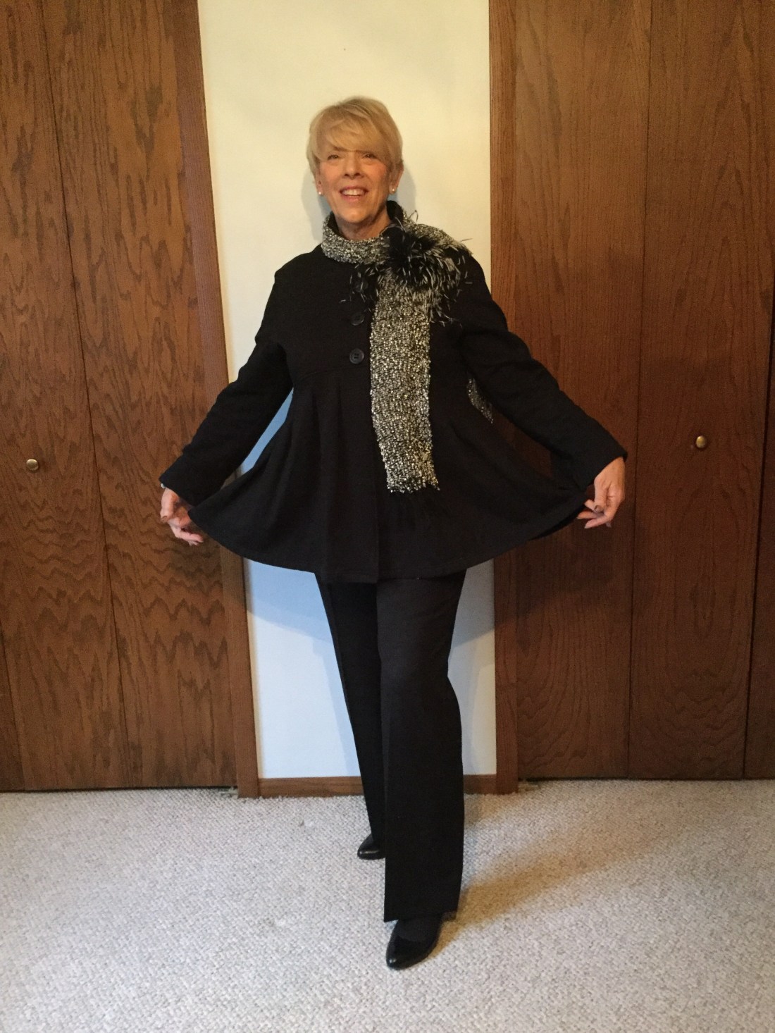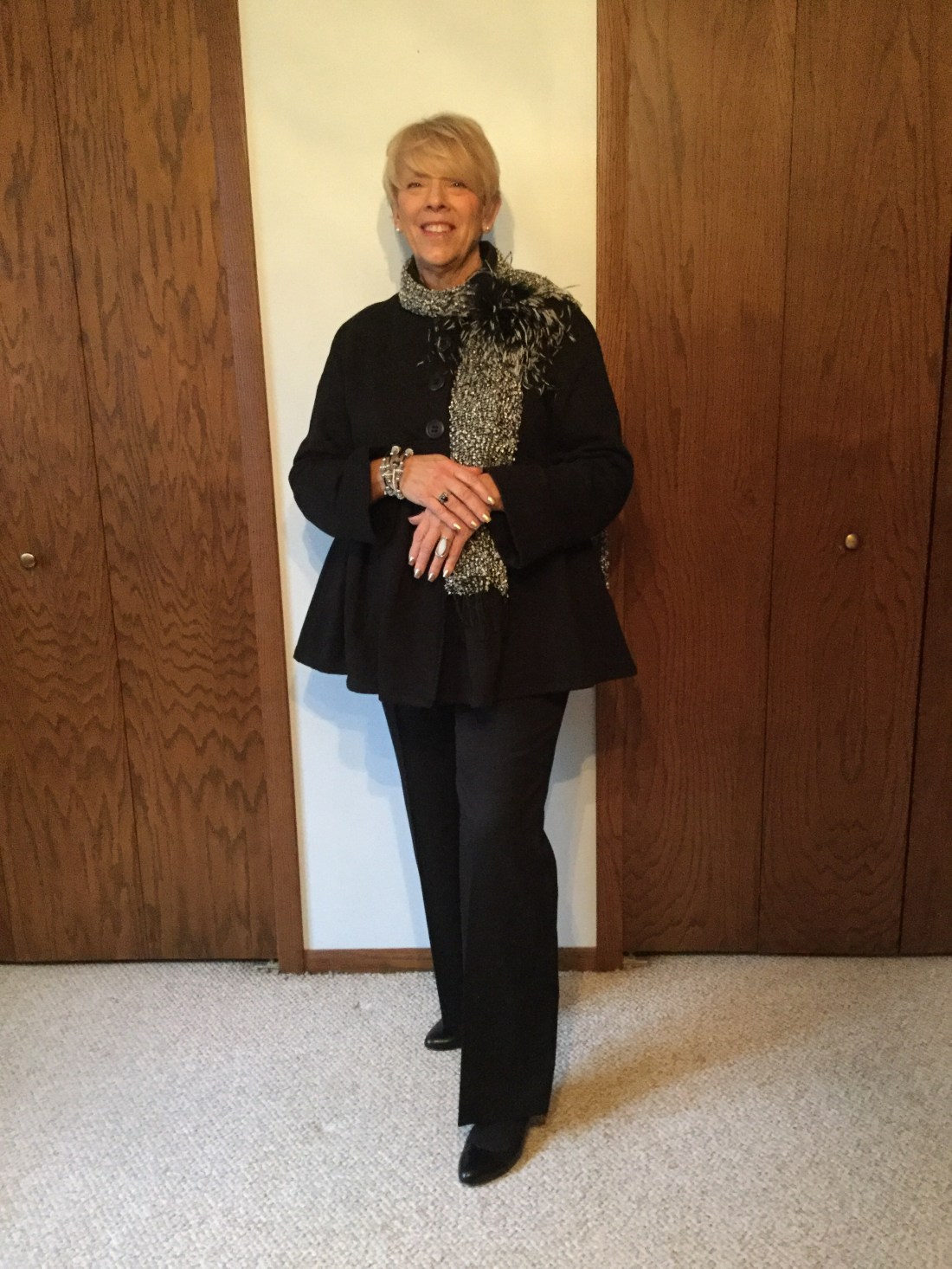 I love this jacket. It is fitted on top and flairs at the bottom. It hides all the “tiers”. There is nothing like a little white-on-black to draw your eyes to your focus area. I am wearing a simple black and white scarf that I have paired with a furry pin. Taking the black all the way down tends to make me look thinner. I am carrying the black and white theme in my jewelry. I don’t have much in the way of fine jewelry but I do like a good pair of pearl earrings.