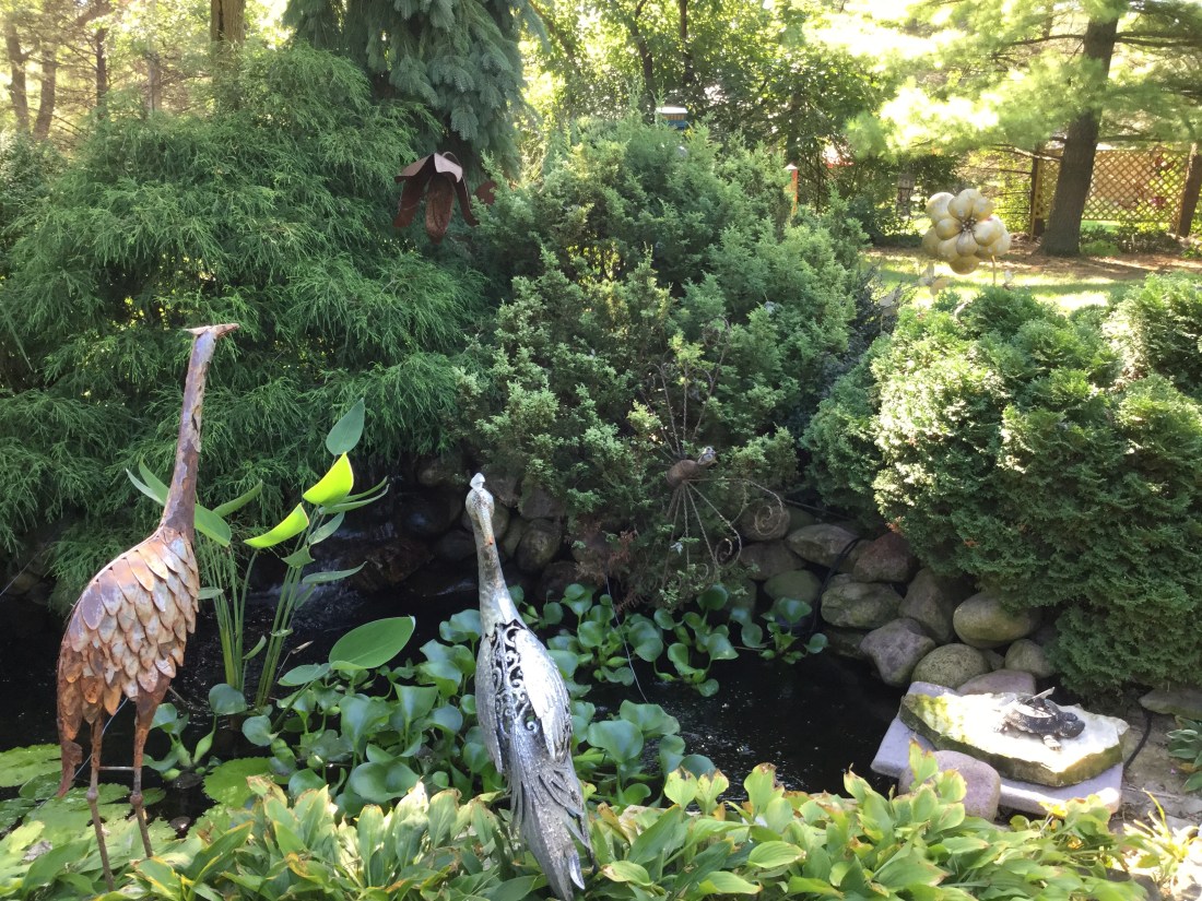 You cannot see all the pond but you can see some of the decorations I have placed around it. You also can’t see the waterfall very well but if you look behind the tall plant between the two birds, the waterfall looks so natural coming out below the evergreen. If you look close, you can see the some of the decorations like the birds, the butterfly, the metal flowers and the turtle sundial. I like natural materials in the garden so most of my garden “jewelry” is made of metal. On one of the previous blogs you saw the lounge chair, that sits just to the right of the birds, where I sit and relax.