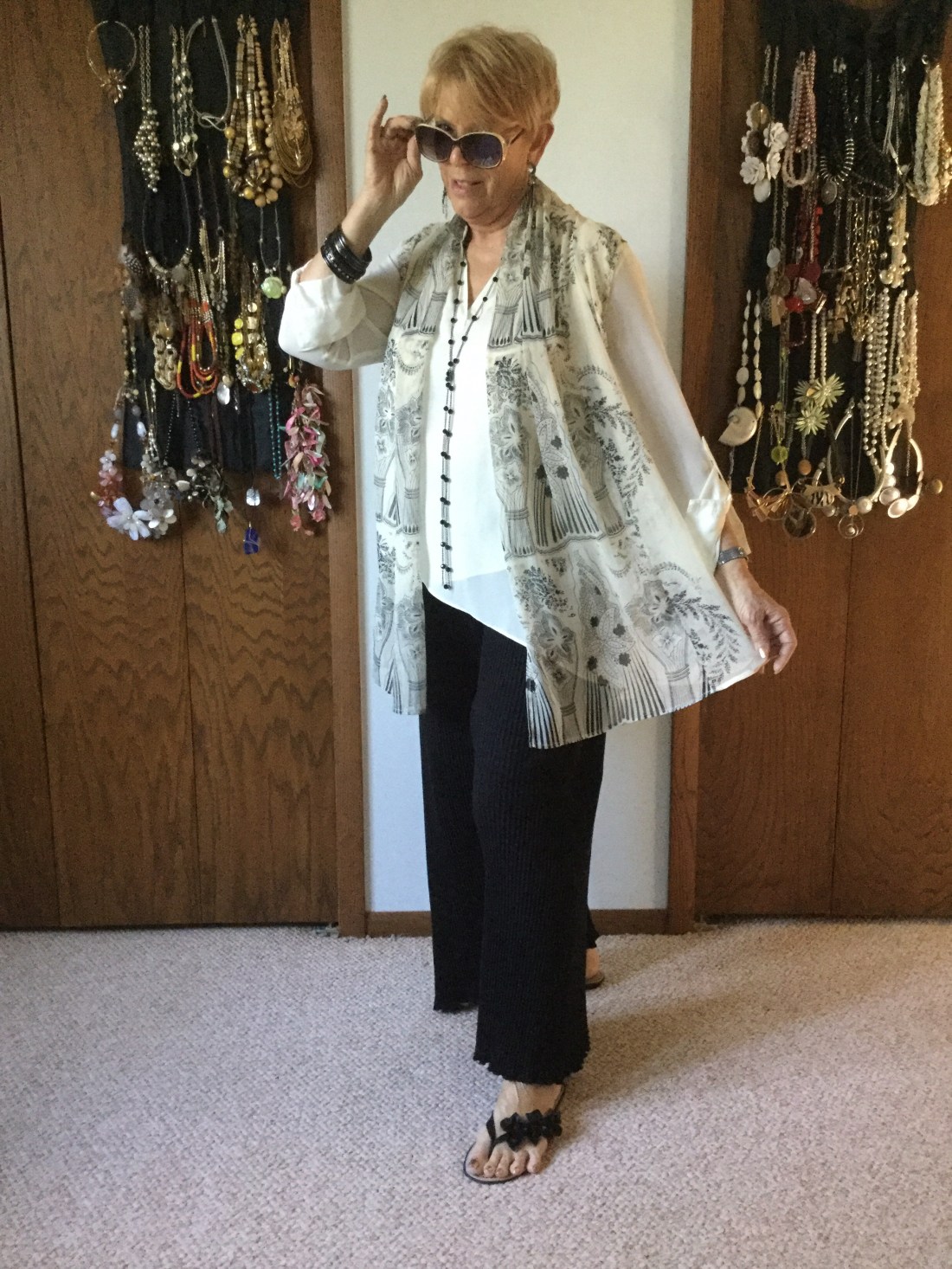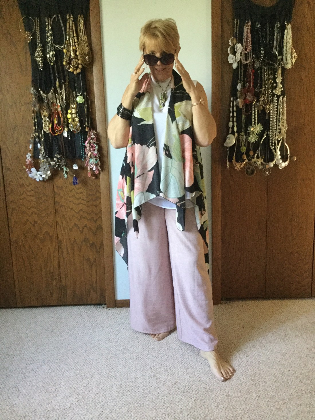 I was just at the cottage in Michigan and took a walk to the beach. Looking at the water inspired me to write about wide leg pants. I love the scene in a movie where the female lead walks on the beach, the light breeze blowing her hair and her clothes are billowing softly behind her as she moves. This outfit would be perfect for a scene like that because each piece is so light weight. The material of the pants is made of a silk/rayon blend and the white, sheath layered, sleeveless blouse and vest are straight polyester which means they are as light as air. Let me tell you the best part of all, the wide leg pants I am wearing throughout this blog have elastic waists. Yeah! I am not wearing shoes because I am picturing myself walking on the beach as the leading lady of my own movie. Of course when I walk on the beach I need my sunglasses ( I have 20 pairs so I can coordinate them with my outfits). Let’s talk accessories. I am wearing a peachy pink watch, pearl drop earrings, several black bangle bracelets and a beautiful necklace that I have described below.