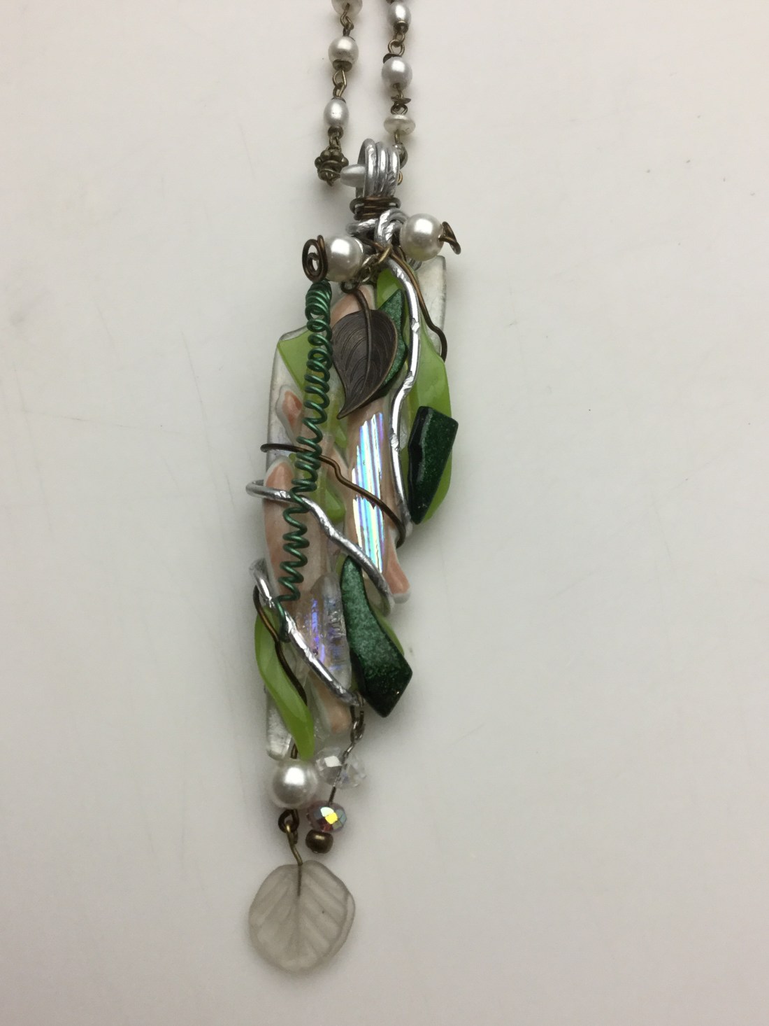 This piece was made by a local Michigan artisan and bought in a little shop in Saugatuck, Michigan. It is made of beach glass, beads, faux pearls and pieces of wire. It looks great with the vest I wore in the previous picture.