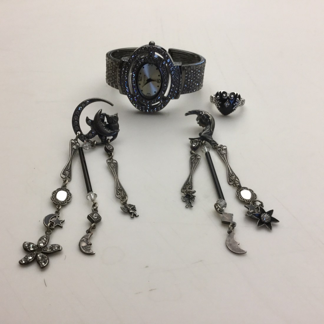The earrings and watch have teeny tiny crystals in them and the ring has a teeny weeny diamond. I love how the earrings are similar but not the same. The lighting of the camera makes the crystals in the watch look like they have a bluish tinge but they are clear crystals. These accessories go so well with the toile vest. Not a great picture of the earrings because the one on the right is flipped over but you get the picture (no pun intended).
