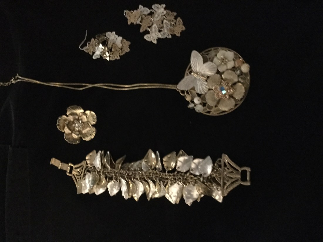 The necklace is gold and white with some simple beading. It has a butterfly and flowers on it and the background looks like leaves. The dangling butterfly earrings and the leaves on the bracelet are also gold and white. The ring is large and has tiny rhinestones in the middle. Each piece was bought individually but they look like they are a set. I love costume jewelry. It is much more interesting and fun than my fine jewelry.