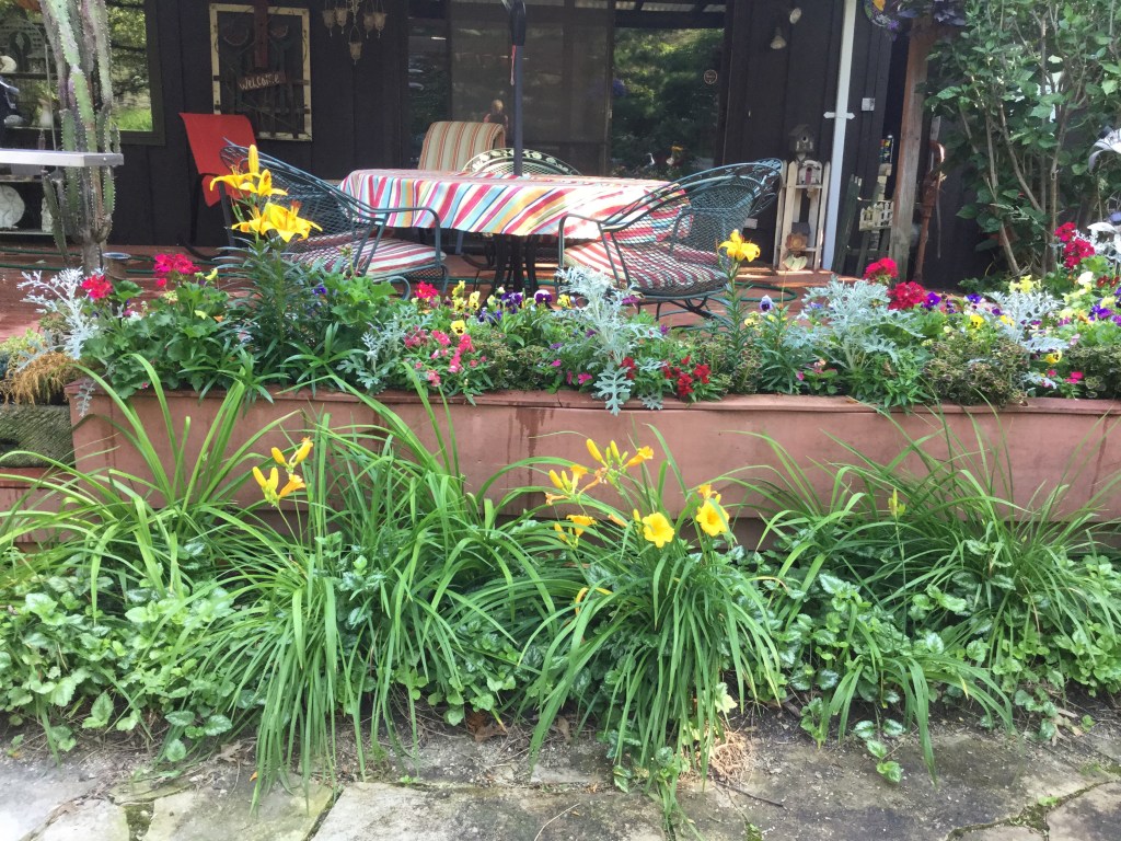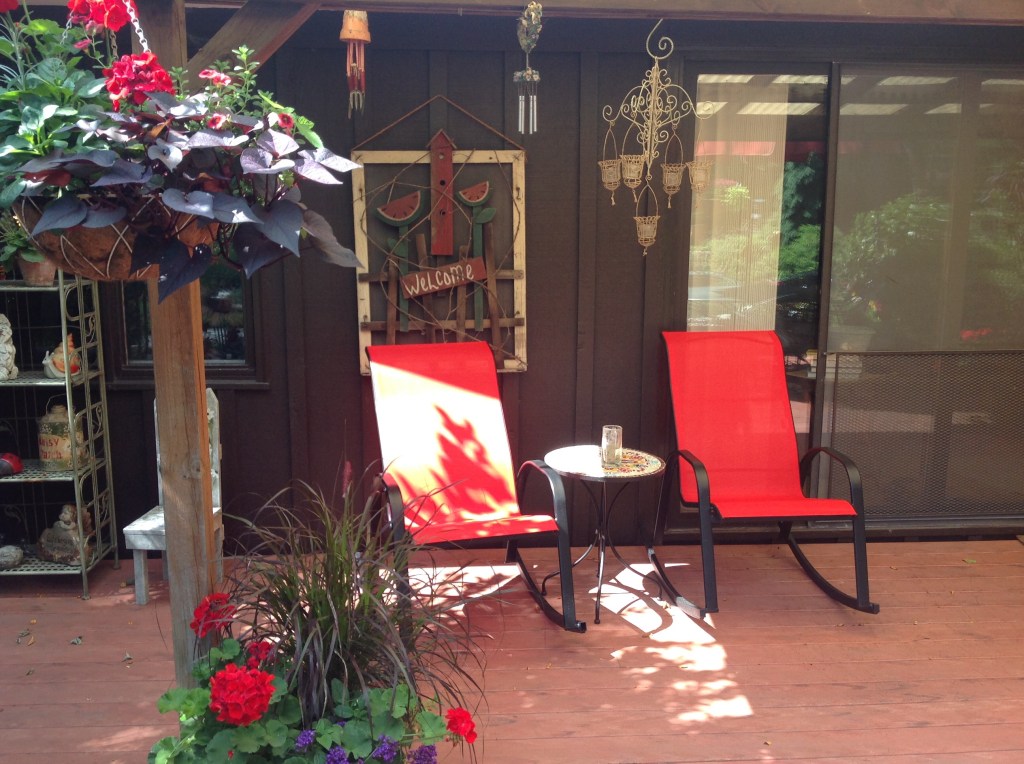 Red flowers are beautiful when planted around the border of a small yard or in containers around the deck. However, I learned that when you have a large lot and you plant a perennial garden 75 feet away from the deck you cannot see the red flowers. They get lost in the see of green. From my deck I could see the pink of the queen of the prairie and the white of the metallic flowers but the red flowers disappear. The same is true of deep purple flowers. These bee balm plants stand 5 feet tall and there is nothing worse than mass planting a beautiful plant then not being able to enjoy it. I eventually ripped them out because I felt disappointed in my choice and I wanted to plant something I could see as I relaxed on my deck. So remember when you are planting a garden or even a container to take into consideration the backdrop of the plants.