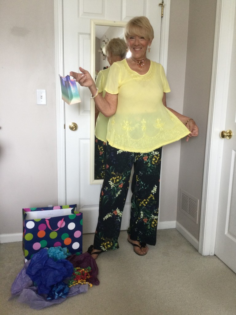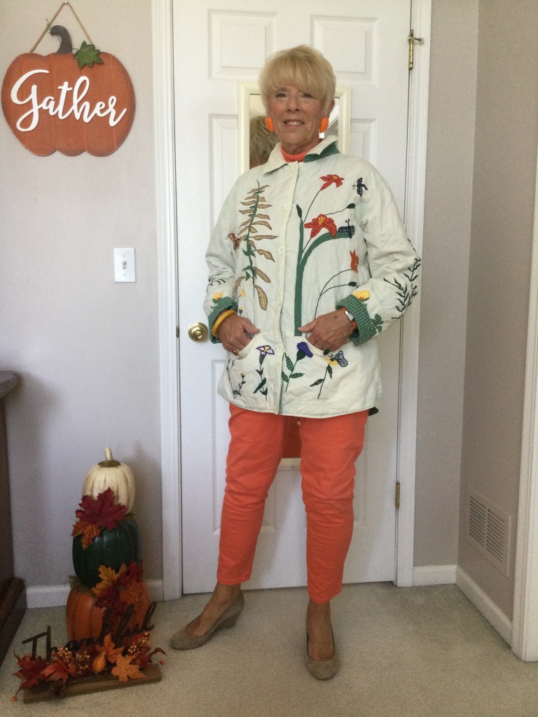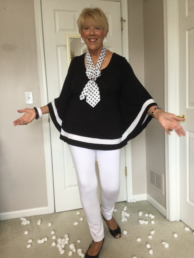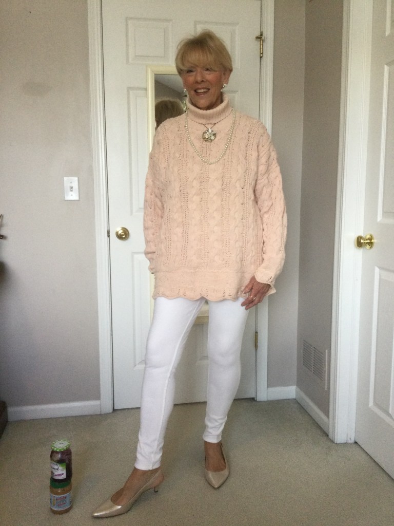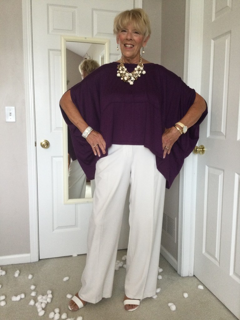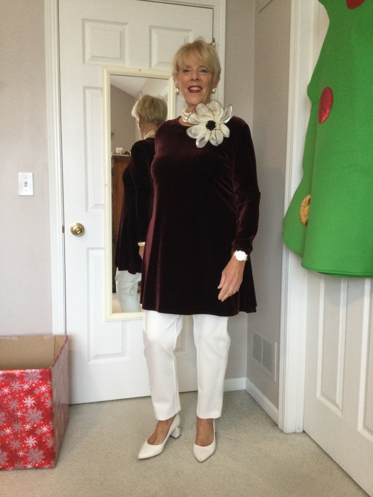 True story about this top. When my daughter was in college I took this rich burgundy red, velveteen dress out of her closet to wear with a pair of black leggings. She is now 42 years old which makes this top at least 26 years old. As you can see it never left my closet and it looks as good today as it did the day she bought it. It is the oldest article of clothing in my closet and I just can’t part with it. I now pair it with winter white pants and cream colored shoes.