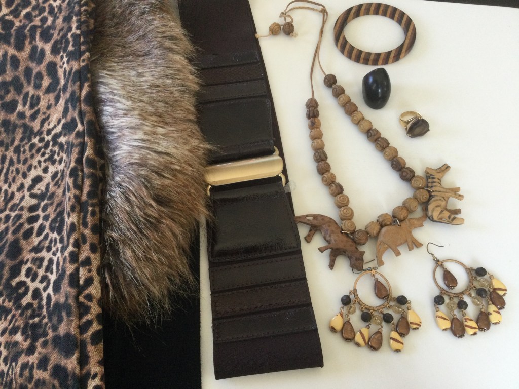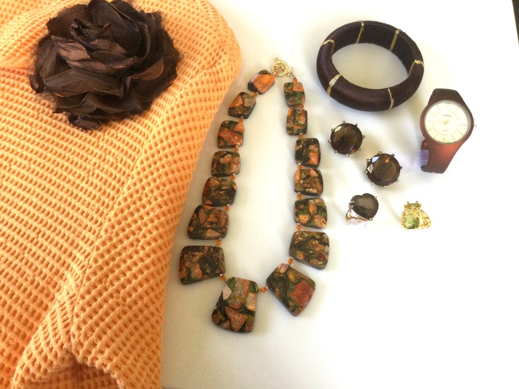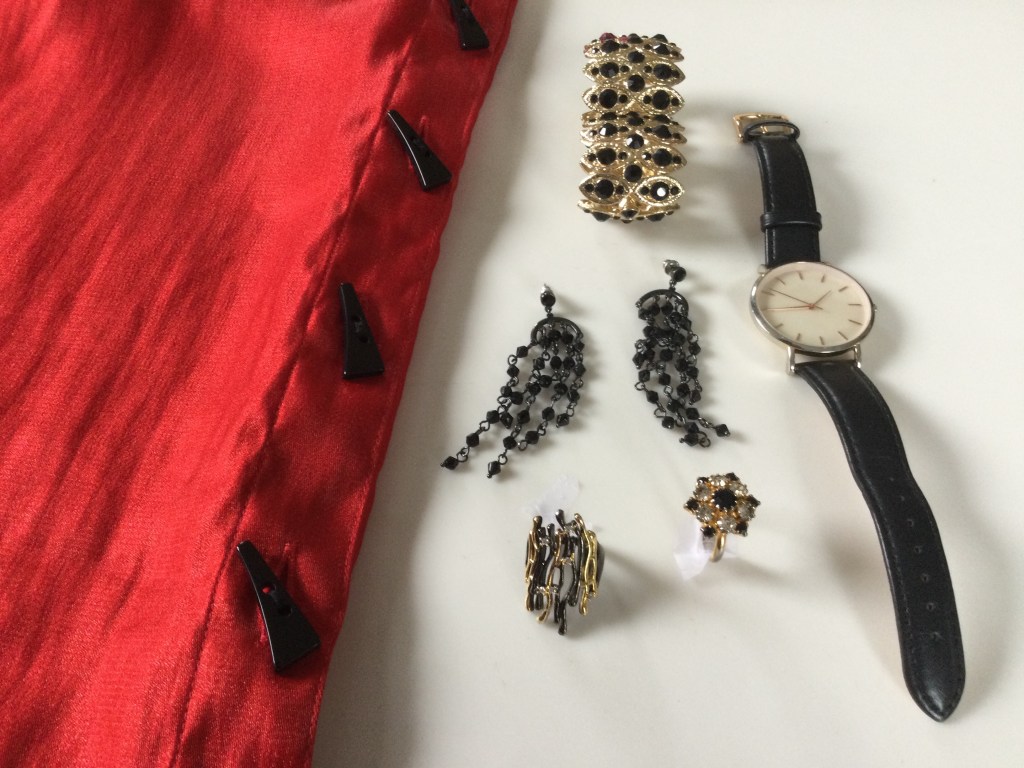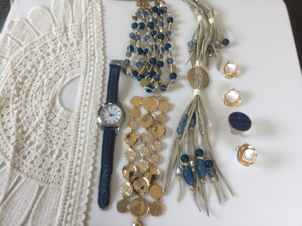 In this picture you can get a better view of the pieces of trim next to the patches. All the accessories are gold or a combination of dark red and gold. I love to layer my necklaces and the beads on the short necklace are beautiful. The earring and necklace are a set. The stones in the rings are ruby and garnet.