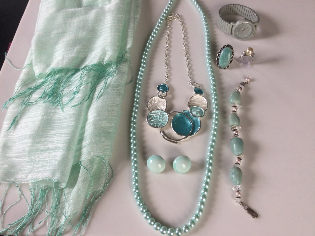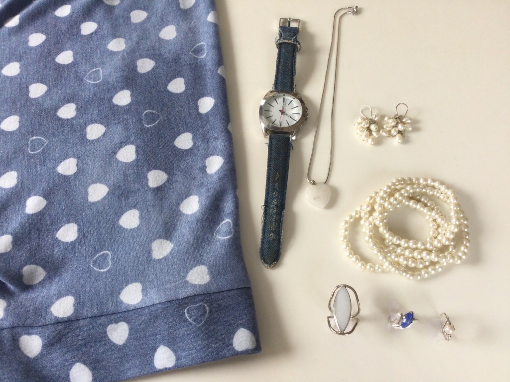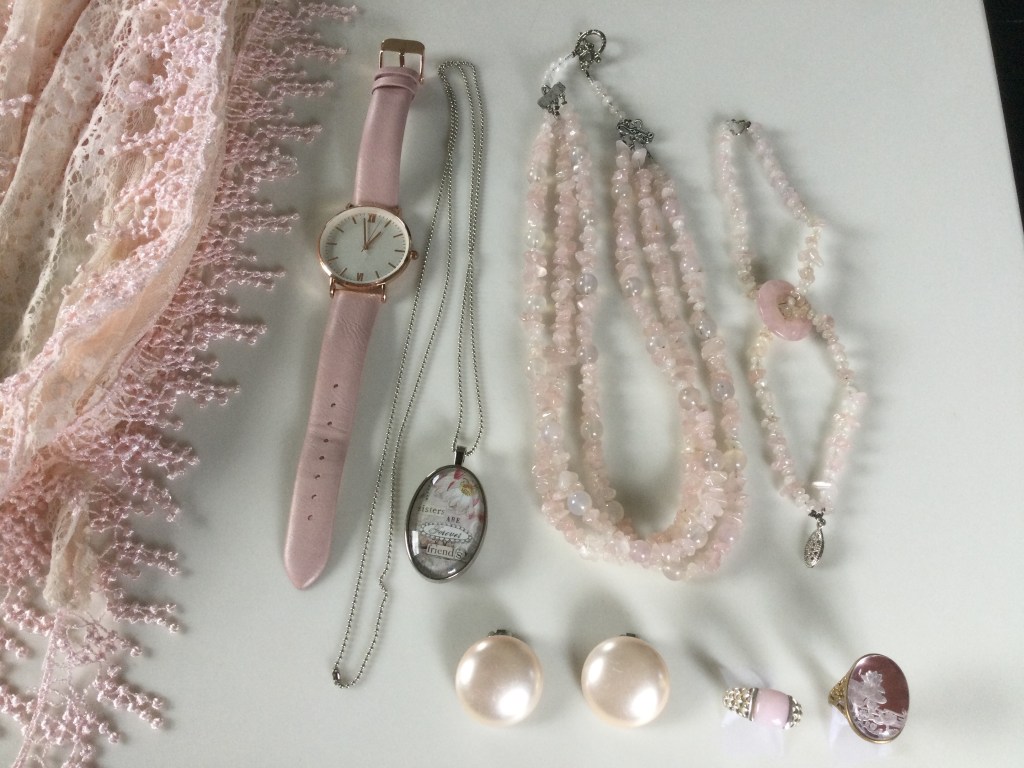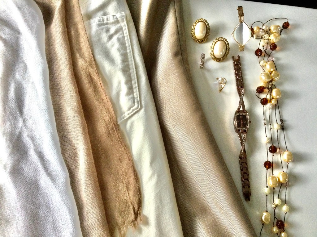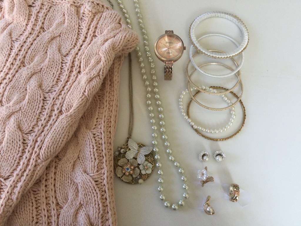 I think wearing all off white accessories really makes this outfit look classy. You can never go wrong with pearls and this choker looks so good next to the flower pin. The rest of the grouping is a combination of gold and off white accessories.