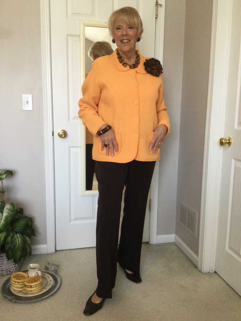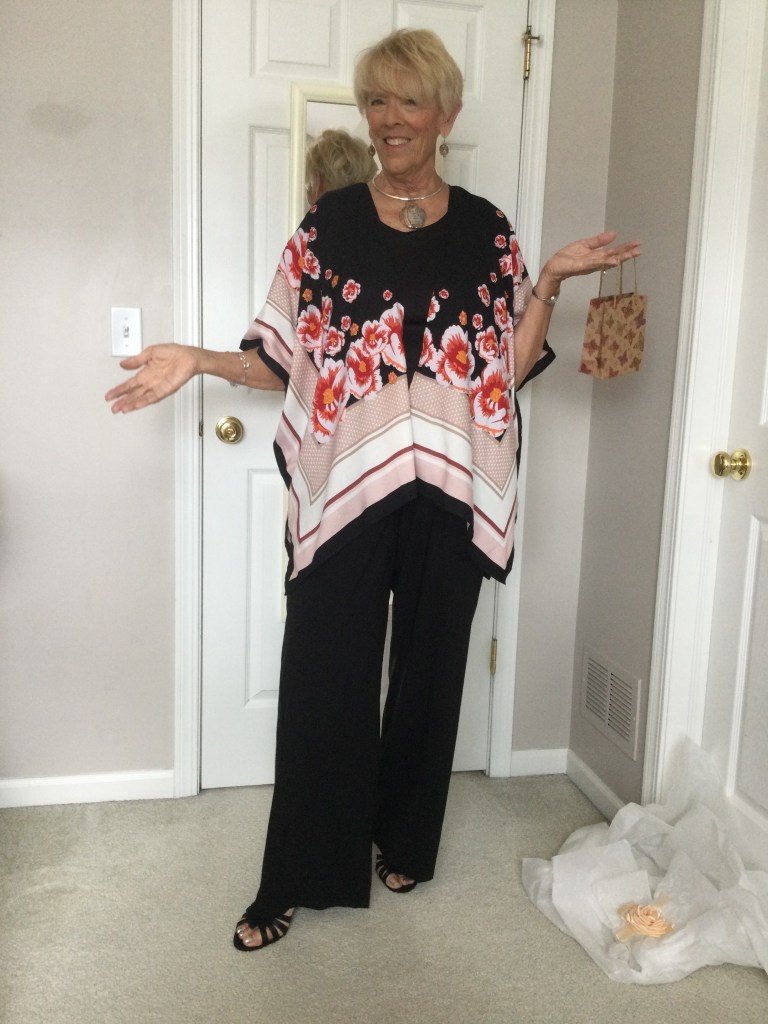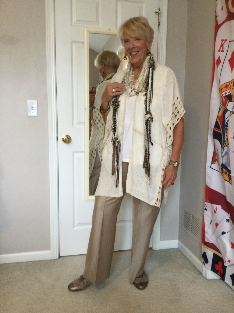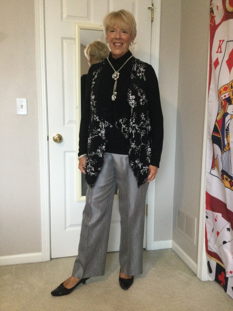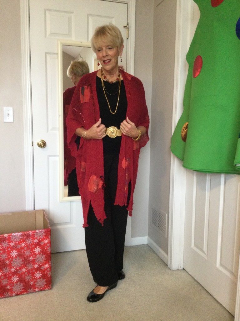 I love unique pieces like this dark red topper I got at a craft fair. It is a mesh piece of material and the crafter sewed black and red patches and wove pieces of trim in random spots on the topper. Because of the black in the patches I paired this outfit with a black short sleeved loose fitting top and a dress pair of pants. I am wearing a stretchy gold belt. The only time I wear a belt is if I am wearing a jacket or topper that minimizes my belly as does the black outfit. My shoes are shined black patent leather with a small wedge heel.