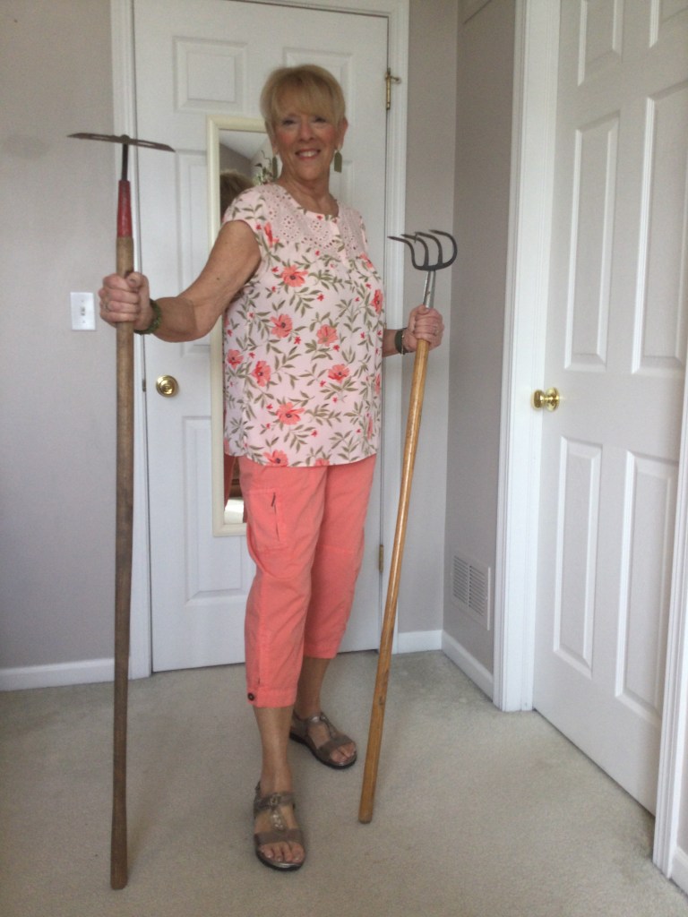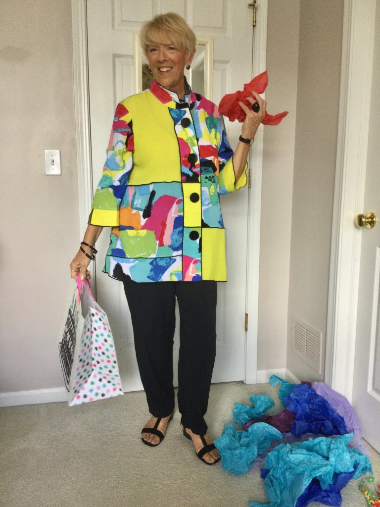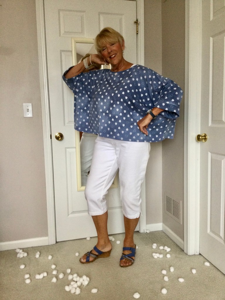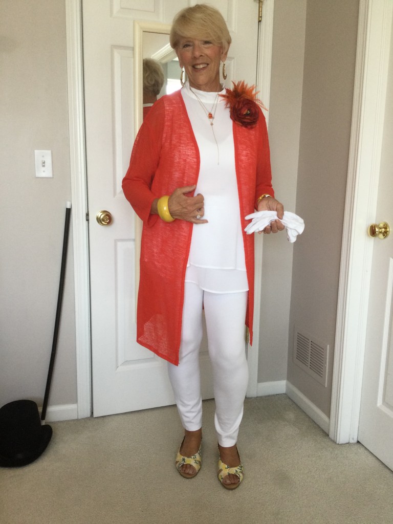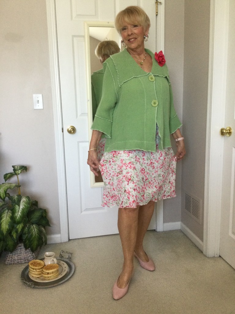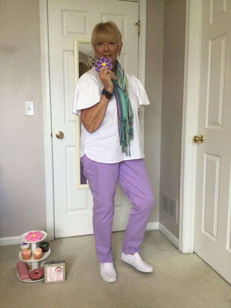 I love unique pieces like this dark red topper I got at a craft fair. It is a mesh piece of material and the crafter sewed black and red patches and wove pieces of trim in random spots on the topper. Because of the black in the patches I paired this outfit with a black short sleeved loose fitting top and a dress pair of pants. I am wearing a stretchy gold belt. The only time I wear a belt is if I am wearing a jacket or topper that minimizes my belly as does the black outfit. My shoes are shined black patent leather with a small wedge heel.