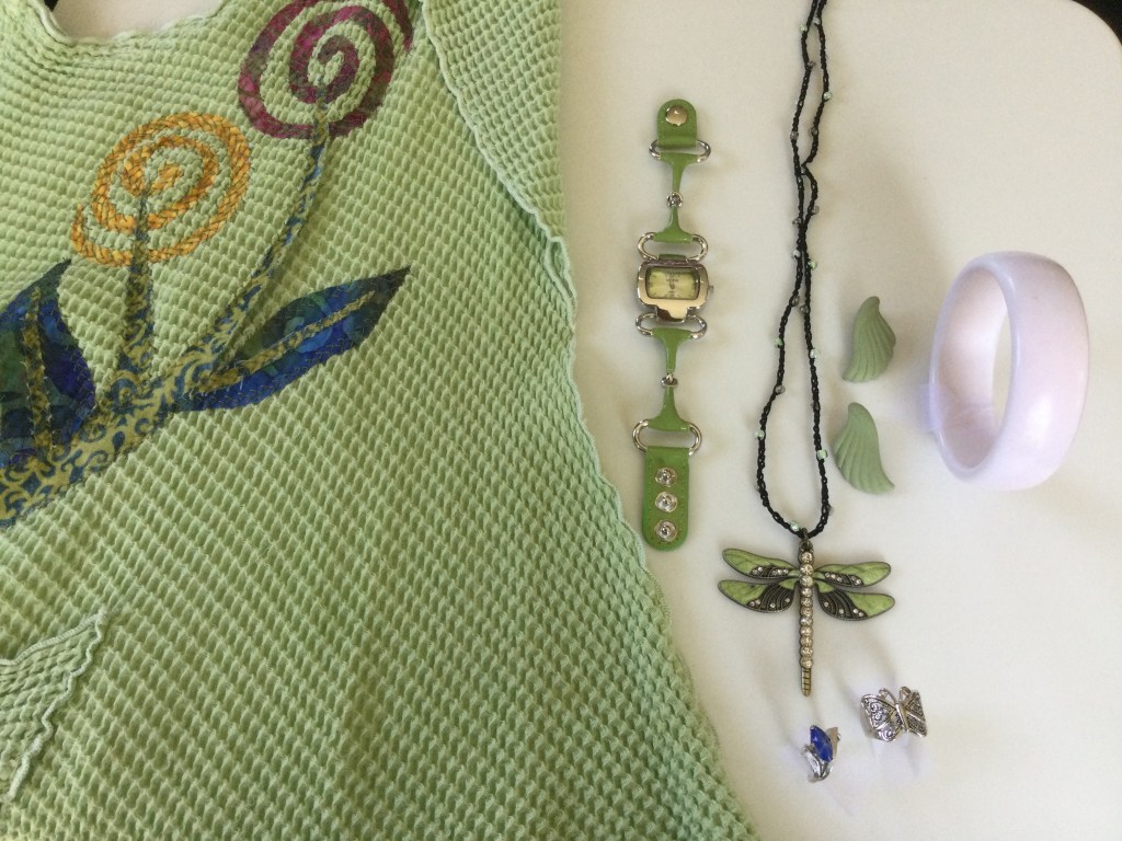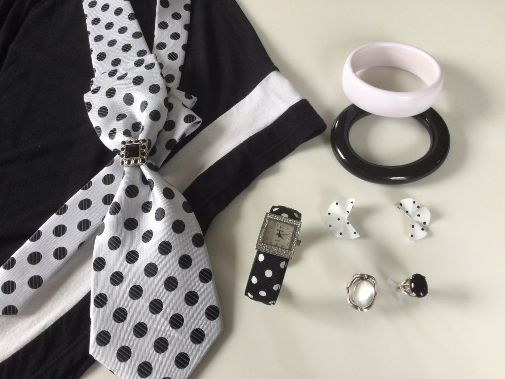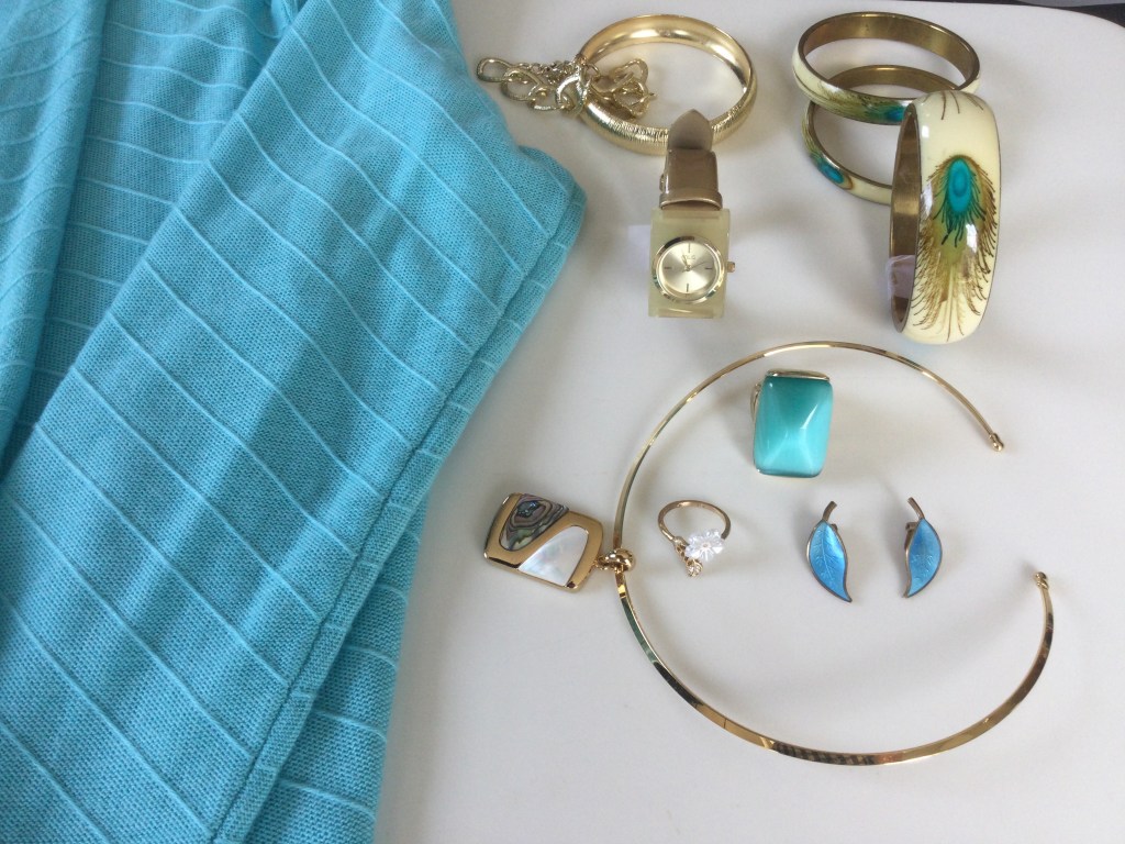 Since I am standing up the collar I chose not to wear a necklace. I love the multi strand beads of the earrings. The gold and black bracelet and one of the rings contain similar beads. The other ring is very unique and it looks like a grouping of black and gold sticks with a little bling added. I bought it at an antique shop in South Haven, Michigan.